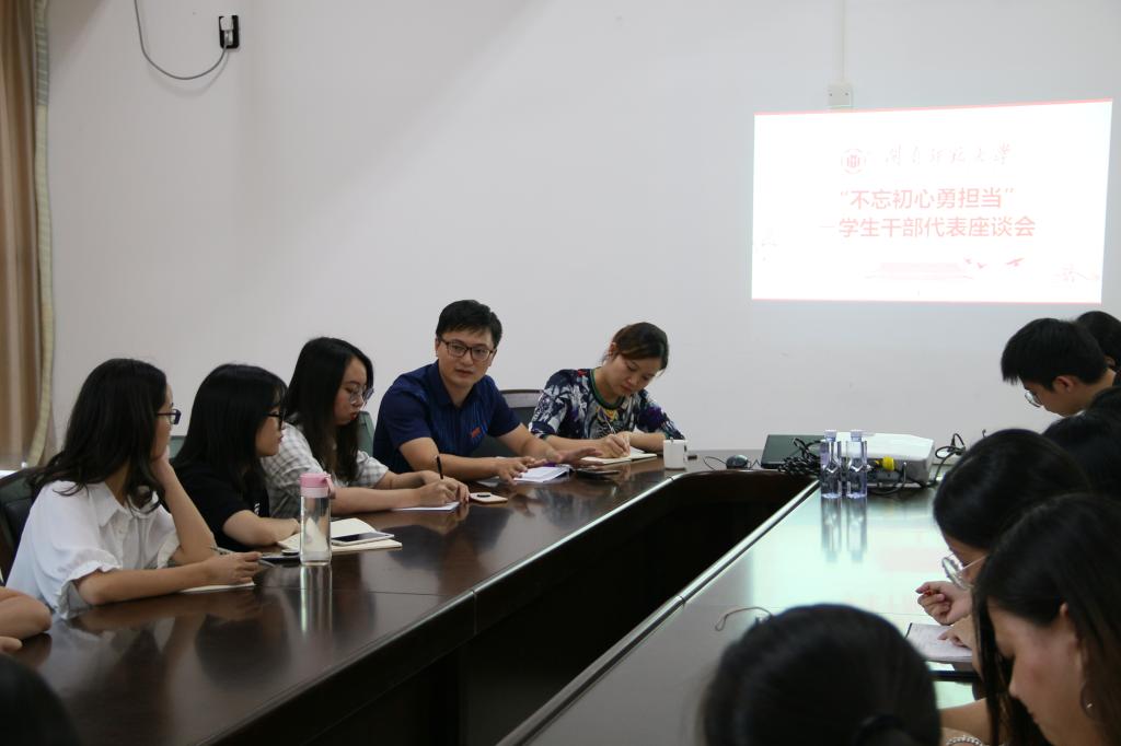 9月26日下午,校学生工作处在科技楼1209北会议室,召开“不忘初心勇担当”的学生干部座谈会,听取学生干部心声,了解学生干部队伍建设情况。学生工作处副处长李苗、各学生组织指导老师、20多名校级学生组织的干部代表参加座谈。