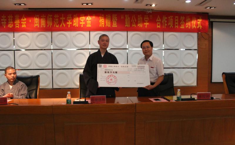 此次活动中,厦门南普陀寺慈善会为我校200名家庭经济困难学生设立了每年100万元慈善助学金。林致远处长代表学校与南普陀寺慈善会签订了捐赠协议,并向捐赠单位颁发捐赠荣誉证书。