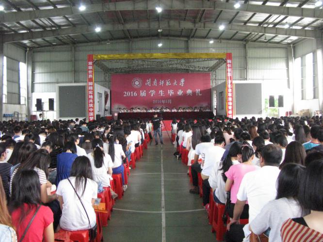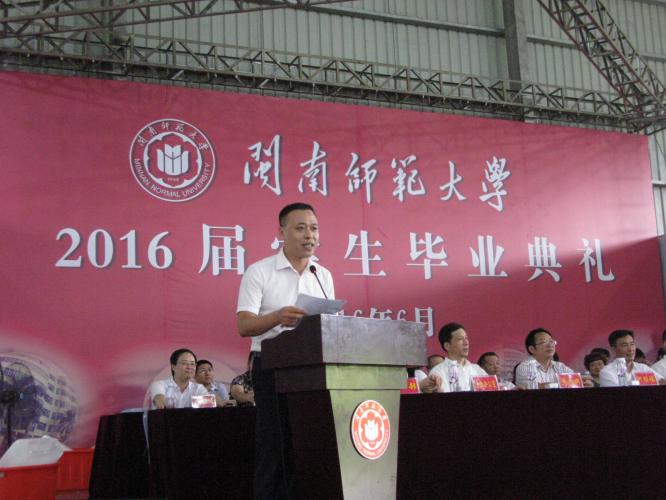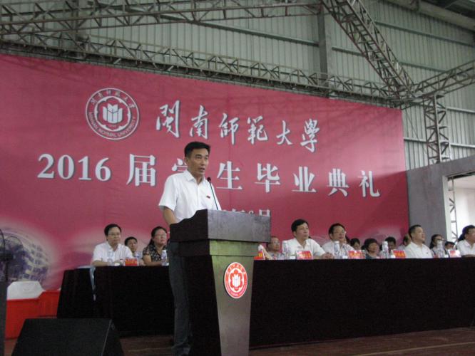 凤凰花开时节迎来了毕业季,校园里到处洋溢着毕业生的欢声笑语。6月13日上午7时,我校在球类馆隆重举行2016届学生毕业典礼,欢送5300多名毕业生。校党委书记林晓峰,校长李进金,校党委副书记吴彬镪,副校长肖庆伟、何绍福、蒋一婷,纪委书记黄来渊,校长助理林静华,学校各机关、教辅单位主要负责人,各院系党政领导,全体毕业班辅导员和2016届本科毕业生、硕士毕业生参加典礼。毕业典礼由吴彬镪副书记主持。 毕业典礼在雄壮的国歌声中拉开帷幕。肖庆伟副校长宣读了学士学位获得者及2016届研究生优秀毕业生、本科生优秀毕业生名单。4777名毕业生获得学士学位,1034名毕业生获得优秀毕业生荣誉称号。 毕业生代表数学与统计学院张天衢同学深情地回顾了四年大学生活,地表达了对母校和老师辛勤培育的感激之情,表示将牢记师长们的殷切期望,开拓进取,以更加优异的成绩回报学校。在校生代表2013级文学院黄蓉同学表达了对学长学姐们的诚挚祝福,表示会继续追寻学长学姐们的奋斗足迹,为学校的发展做出积极的贡献。教育科学学院林培锦老师代表全体教师发言,他向顺利毕业的学子们表示祝贺,风趣幽默地和同学们分享了生活感悟,并希望同学们珍爱亲情,相信爱情,承载着母校的关怀,取得更大的成功。 在热烈的掌声中,李进金发表了表热情洋溢的讲话。他向圆满完成学业、即将扬帆远航的学子们表示热烈祝贺和美好祝愿。他肯定了同学们几年来在学业和思想上取得的进步,为学校发展所作出的积极贡献,表达了对同学们的依依不舍之情。临别之际,李校长殷切勉励同学们坚持敏于求知,学会善思明辨,养成多元化阅读和思考的习惯,保持永远学习、探索新知的人生状态。勉励同学们坚持勇于创新,学会慎思进取,积极融入创新的大潮,敢为人先,做走在时代前列的开拓者和引领者。希望同学们坚持勤于修身,学会涵养德行,在未来成长的道路上,立德修身,勇于担当,努力做有知识更有文化、有智慧更有责任、有学问更有修养的闽师人。 典礼结束后,各院系分别在分会场举行毕业生学位授予仪式,为毕业生颁发学位证书,拨穗并合影留念。 青春是一场相识,青春是一场远行,衷心祝贺2016届全体毕业生一帆风顺,好梦成真。