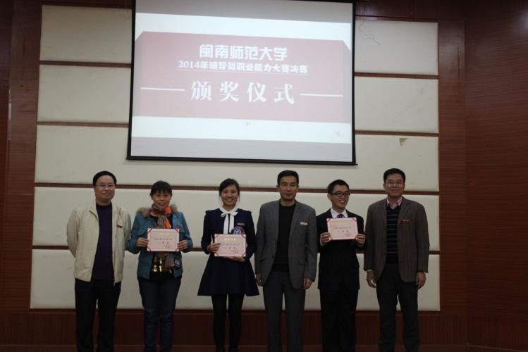 最终,化学与环境学院陈慧燕获得一等奖,教育科学学院陈春慧、外国语学院罗立满、管理学院白秋纯3位老师获得二等奖,历史与社会发展学院阮莉、新闻传播学院许莹、邓拓、外国语学院李建民、化学与环境学院周翔、体育学院郑小贝等6位老师获得三等奖,7名辅导员获得优秀奖。在场的领导分别为获奖选手颁奖。