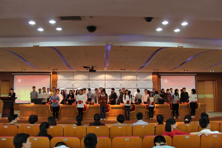 国家奖学金获得者文学院史硕婷同学代表获奖集体和个人上台发言,她对学校的悉心栽培和老师的无私关怀表示衷心感谢,并表示要以受表彰为起点,树立正确的价值观和远大理想,自立、自信、自强,书写无愧于时代的壮丽篇章,为实现中国梦贡献力量。