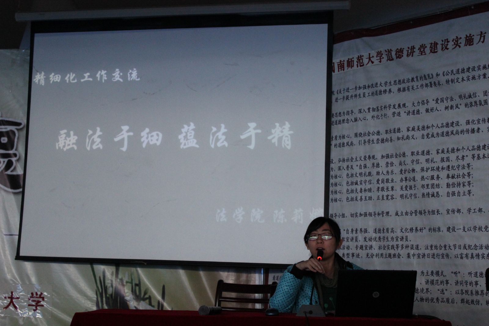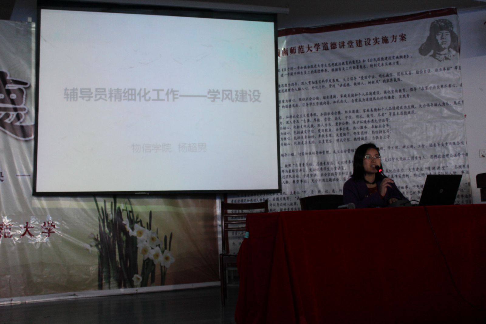 随后,来自文学院、物理与信息工程学院、体育学院、法学院、艺术学院、新闻传播学院的6名辅导员依次做精细化主题交流报告,总结工作成效,介绍工作亮点,交流先进经验,分享工作心得。“制作《辅导员工作周例表》,宿舍一周一走访”“成立学生党员学习帮帮团,全民总动员,带动后进学生。”“制度建设要公开、民主、公正”“利用好自媒体与学生进行谈心交流”“精细化工作就是标准化建设”……每位辅导员围绕