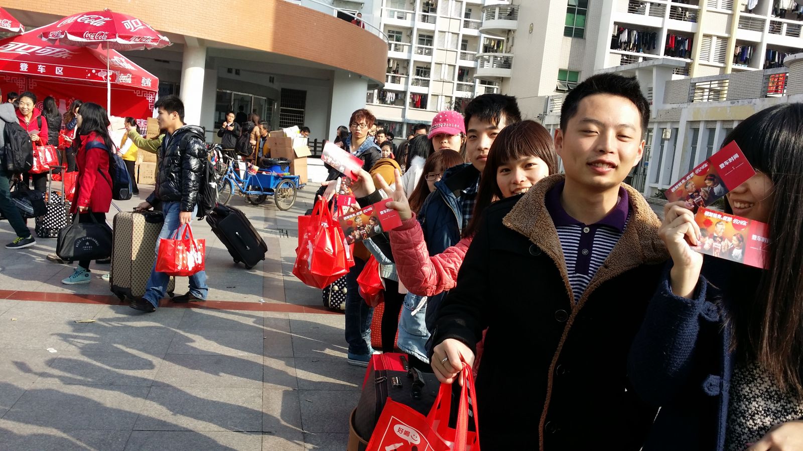 活动当天现场秩序井然,工作人员、学生志愿者热情服务。同学们可以参与各种抽奖、游戏活动赢取丰厚奖品,可以领取免费贺卡,现场投递到可乐邮箱,为远方的亲朋好友送去问候。在登车的间隙,还可以安心坐着观看精彩的表演。4辆“可乐大巴”不停往返于学校和车站,实际接送1800多人次,每个搭车的学生还收到了可口可乐公司送出的一份新年大礼包。同学们对活动给予了高度评价,纷纷在微博上晒出新年大礼包和登车卡,一位同学戏说:“妈妈再也不用担心我回家了!”