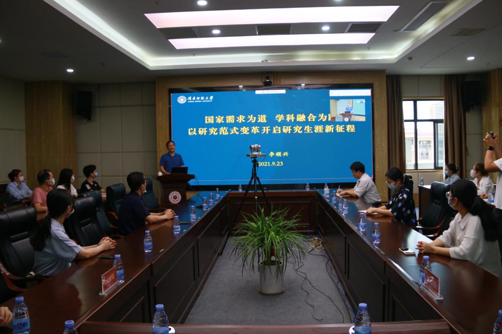 9月23日下午,李顺兴校长在科信楼1607为我校2021级785名研究生上了题为《国家需求为道学科融合为路以研究范式变革开启研究生涯新征程》的“开学第一课”。受新冠肺炎疫情影响,此次授课以线下举行、线上直播的形式进行。副校长张龙海主持,学科建设与研究生工作处、学生处相关老师到场听课。
