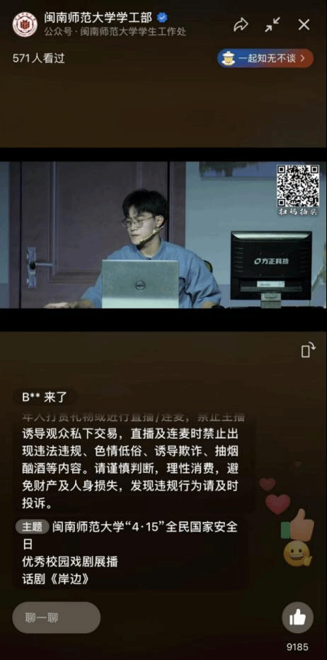 同日晚,我校开展线上互动,直播我校师生编排国家安全教育主题话剧《岸边》。在疫情防控背景下,本次活动以录播话剧线上直播、主持人第二现场分段解说的形式,着重围绕“非法获取国家秘密罪”向学生进行了科普,讲述了青年大学生正处于价值观形成的关键时期,容易受不良信息的误导,淡化国防意识,更要引导青年大学生始终树立国家利益高于一切的国防观念。话剧教育意义深入浅出,共吸引1781人次的师生观看。