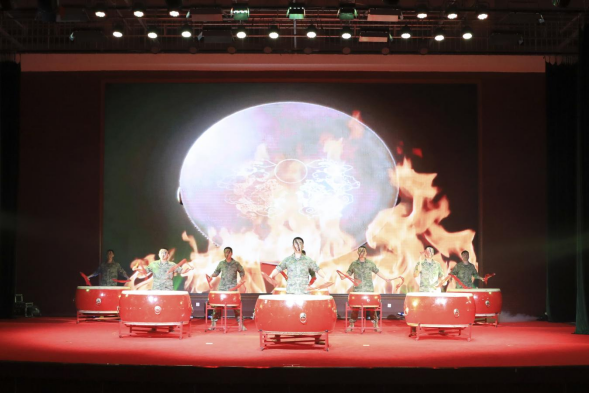 击鼓其镗,浩荡豪迈。演出在部队官兵们雄浑的《雷霆战鼓》中拉开序幕。