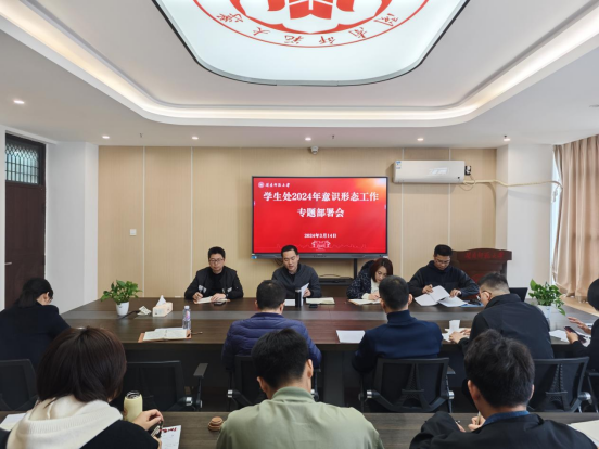 学生处处长蔡斌对学生处2024年意识形态工作进行部署,要求各科室切实守好意识形态“责任田”,持续推动学习宣传贯彻习近平新时代中国特色社会主义思想走深走实,建立健全思想动态调查、学生代表座谈会制度、安全工作周汇报制度、舆情研判工作制度和诉求平台建设机制等于一体的调查反馈机制。完善网络舆情应急处置机制,切实增强网络工作的灵敏度。规范学生处宣传阵地建设,切实增强“一站式”宣传平台矩阵效应。持续实施“思想领航”计划,引导学生积极践行社会主义核心价值观。