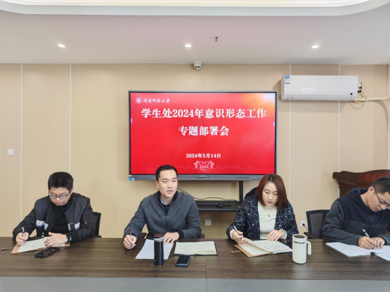为贯彻落实学校2024年宣传思想暨意识形态工作会议精神,推动学生处意识形态工作长效机制建设,3月14日,学生处在科技信息楼北1209召开学生处2024年意识形态工作专题部署会。会议由学生处处长蔡斌主持。