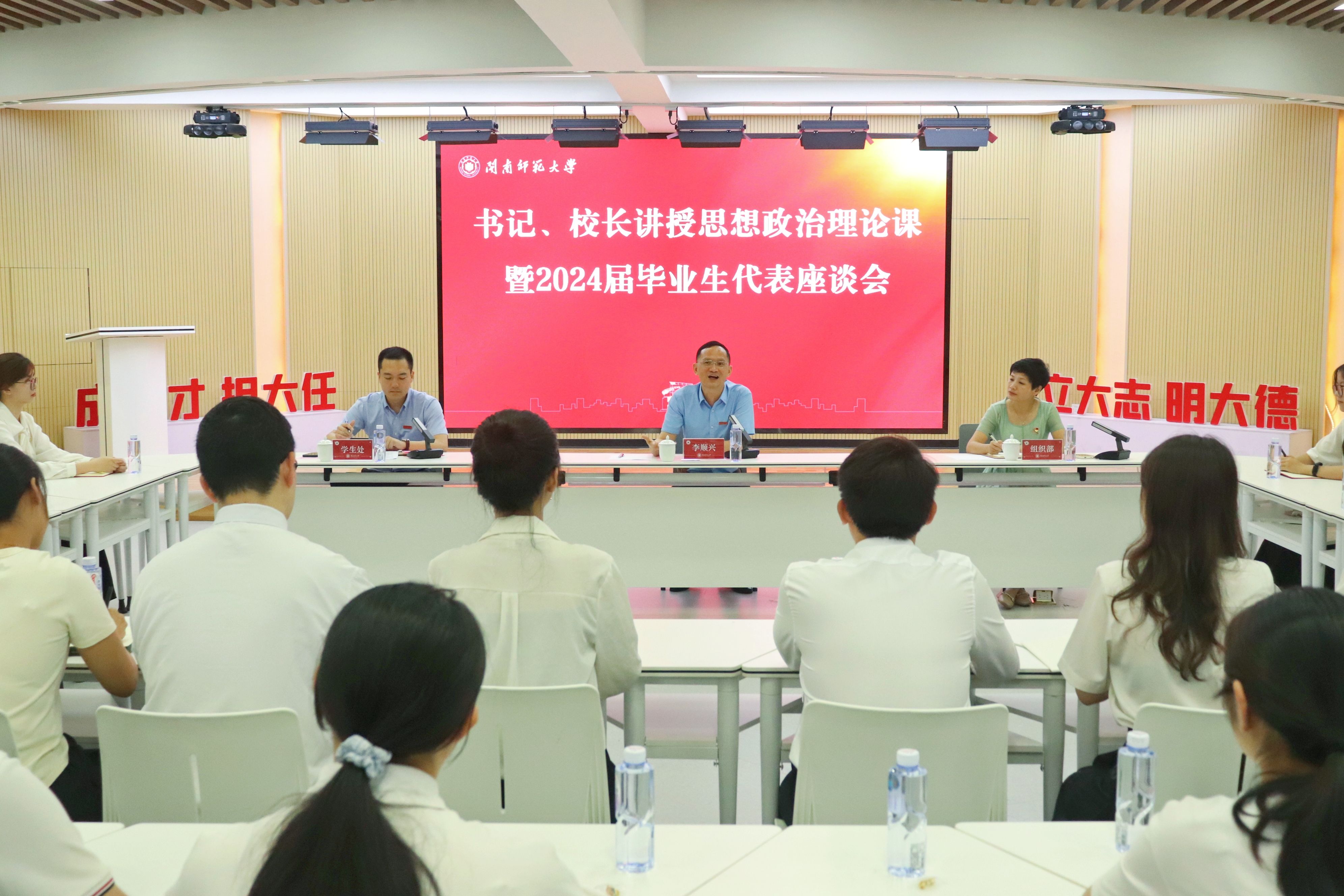 为贯彻习近平总书记对学校思政课建设作出的重要指示和新时代学校思政课建设推进会精神,引导毕业生争做让党放心、爱国奉献、担当民族复兴重任的时代新人。6月18日上午,校党委书记、校长李顺兴在达理学生活动中心三楼多功能厅,为2024届毕业生讲授思想政治理论课,并和来自各学院的毕业生代表座谈交流。组织部、学生处负责人一起参加了活动。