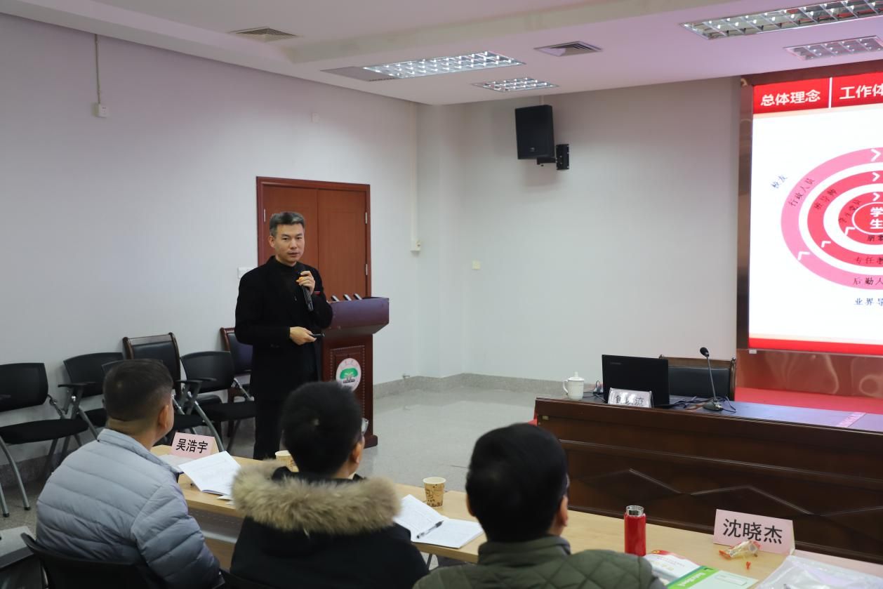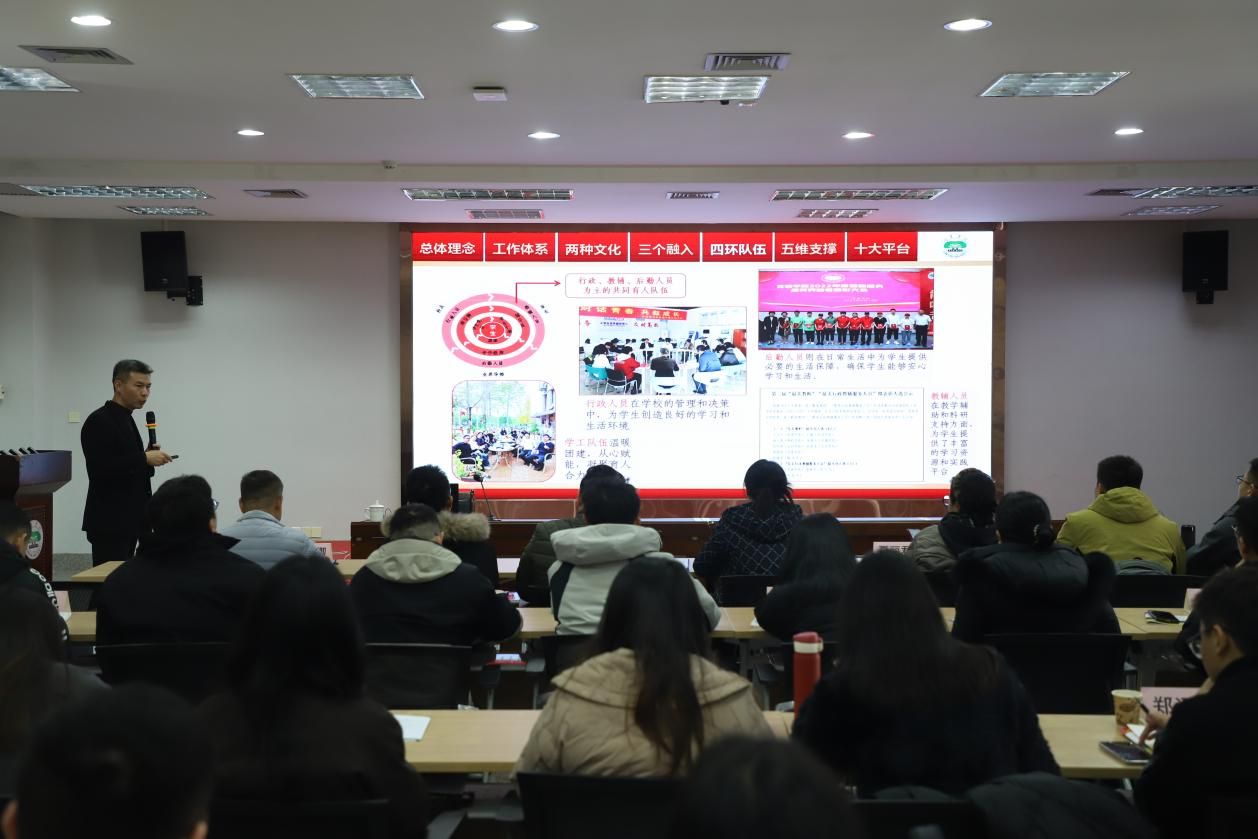 专题讲座环节,龙岩学院学工部部长钟以流以《新时期高校辅导员工作方法的嬗变与创新》为题,立足新形势、新要求,结合龙岩学院“红土培根育新人”工作体系与“一隅心灯”“三生草堂”等十大育人平台建设实践,详细介绍了龙岩学院辅导员工作创新的多维探索。