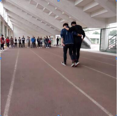 第三个游戏是两人三足,即每组派出4个人,两人一组,绑上其中一人左腿一人右腿,然后向目的地出发来回一次,展开接力赛,两组耗时加起来最短一组获胜。